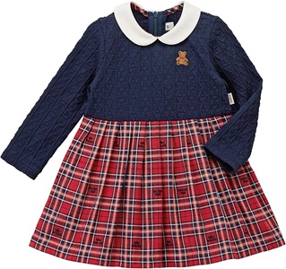 やわらかなケーブルニットを使用した襟付きワンピースです。 ミキハウスベアのワンポイント刺繍をあしらった高級感あふれるデザインで、背中側のファスナーで着脱できます。1枚でも存在感ありなので、デイリーにもタウン着にも最適です。