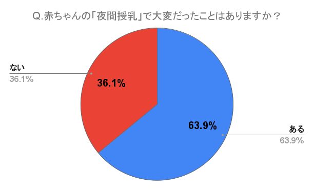 アンケートでの「夜間授乳で大変だったことはありますか?」との問いに、6割以上が「ある」と回答しました。理由としては、「睡眠不足がツライ」など、体力的にキツかったという答えが多く見られました。