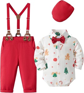 赤×白×緑のクリスマスカラーで、パーティにぴったりなフォーマルセット。長袖シャツ、パンツ、リボン、サスペンダーまでついたかわいいセットです。パンツはコーデュロイ素材で暖かく着られます。