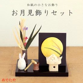 うさぎの餅つきの和紙でできたお月見飾りです。親指ほどの小さなうさぎとふっくらとした満月がお月見にぴったり。玄関やお部屋のアクセントに。