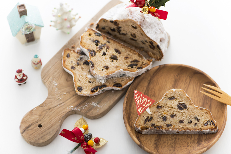 ドイツの伝統的なクリスマスのお菓子。たっぷり練り込まれたドライフルーツやナッツ、香辛料の香りが魅力です。日がたつにつれて深い味わいが生まれるので、ドイツではクリスマスを待ちながら少しずつ食べて、味の変化を楽しみます。粉砂糖をまぶした姿が幼子イエスを包む布に見立てられているとも。