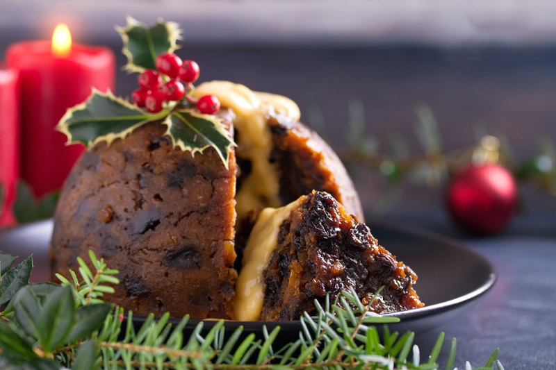 ドライフルーツ、スパイス、ブランデーなどを使った蒸し菓子で、数週間前から熟成させるのが伝統。クリスマス当日には温めて、ブランデーをかけて火を灯す演出も行われます。家族で願いを込めながら混ぜる習慣もあり、英国の家庭的なクリスマスを象徴する一品です。