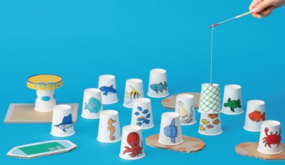 ④魚の絵がある紙コップに、上から網の絵を書いた紙カップを重ねる。うまく引き上げてステージまで運ぶ。