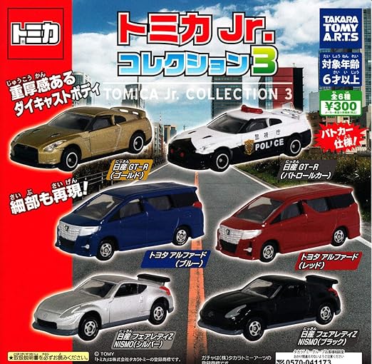 日産フェアレディZ NISMO(シルバー)・日産フェアレディZ NISMO(ブラック)・トヨタアルファード(ブルー)・トヨタアルファード(レッド)・日産GT-R(ゴールド)・日産GT-R(パトロールカー)の全6種類で、どれも本格的で精巧なデザイン。車が好きな子どもなら(パパも)、きっと夢中になって遊ぶことでしょう。対象年齢は6歳以上です。