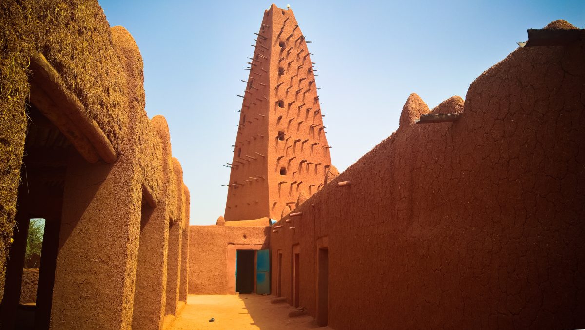 ニジェール北部最大の街・アガデスは、古くからサハラ交易で栄えています。このアガデスの観光スポットとして有名なのが、スーダンサヘル様式で建てられたグランドモスクです。その一部である日干し煉瓦で作られたミナレット(塔)は、高さ27m、トゲのように刺さっているヤシの木の足場が特徴です。この足場は、年に一度の修復のために使われています。
