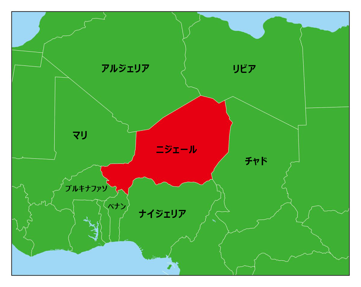 ニジェールは西アフリカの内陸部にある国です。隣接する国はアルジェリア、リビア、チャド、ナイジェリア、ベナン、ブルキナファソ、マリです。