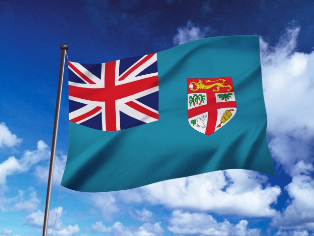 フィジーの国旗には、ユニオンジャックと楯の紋章がデザインされています。ユニオンジャックは、イギリス連邦の一員であることを示しています。楯の紋章には、旧宗主国イギリス王室を象徴する黄色いライオン、イングランドを表す聖ジョージの赤い十字、特産のサトウキビ、椰子の木、バナナ、平和のシンボルであるオリーブの枝をくわえたハトが描かれています。また、地色の水色は太平洋を表しているのだそうです。
