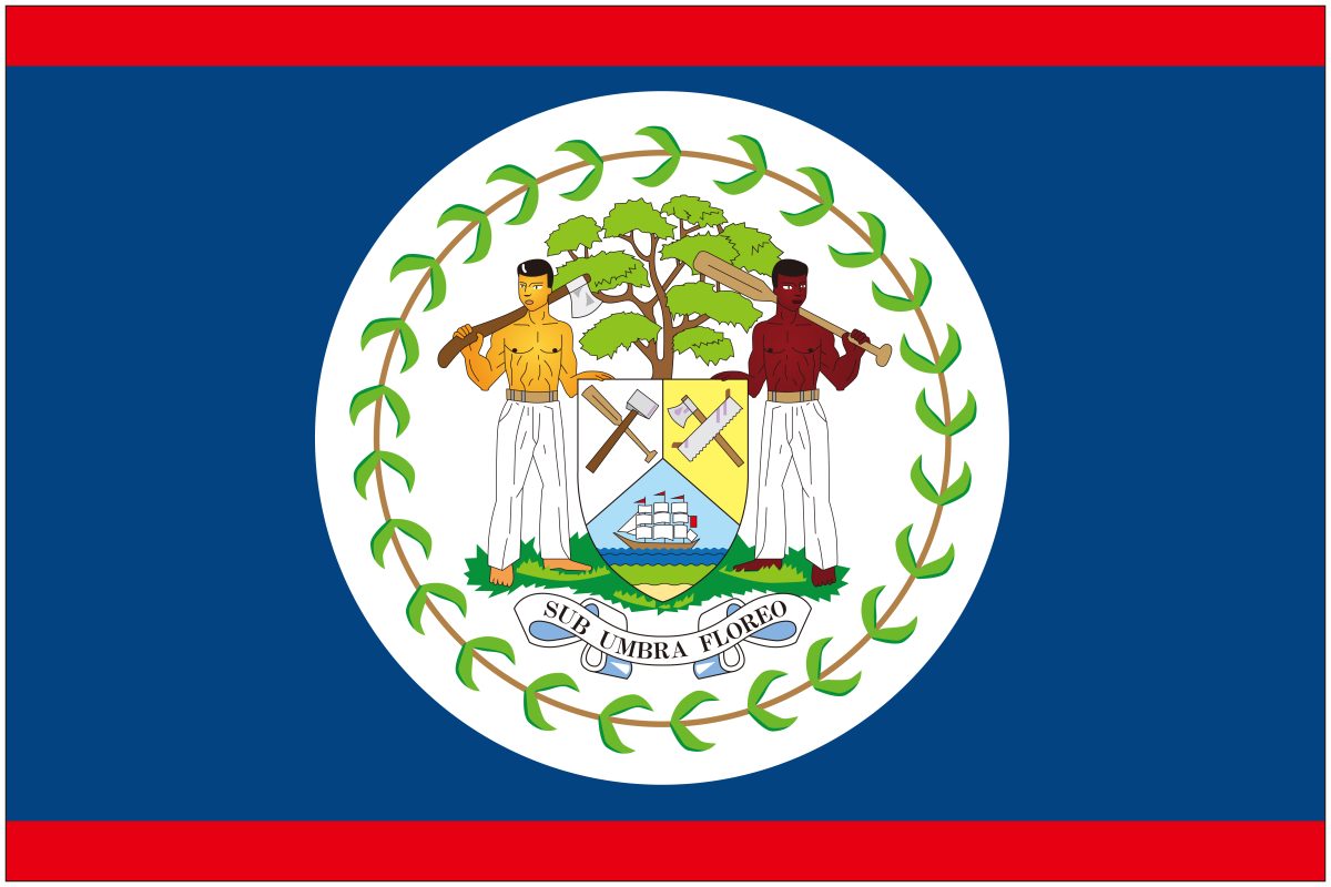 ベリーズの国旗は、青と赤の背景の中央に紋章が描かれたデザインです。
