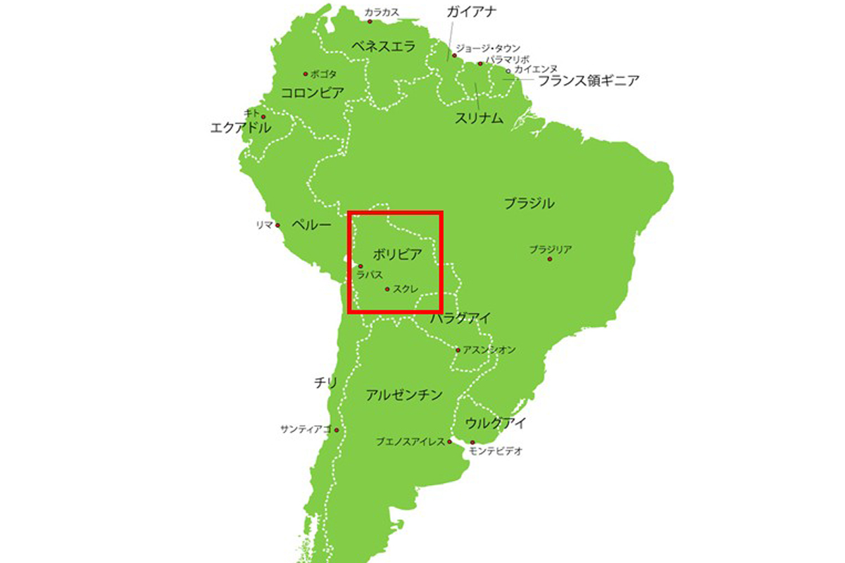 ボリビアがあるのは、南米大陸のほぼ中央部。北から東まではブラジル、南東はパラグアイ、南はアルゼンチン、西はチリ、西北はペルーと接しています。