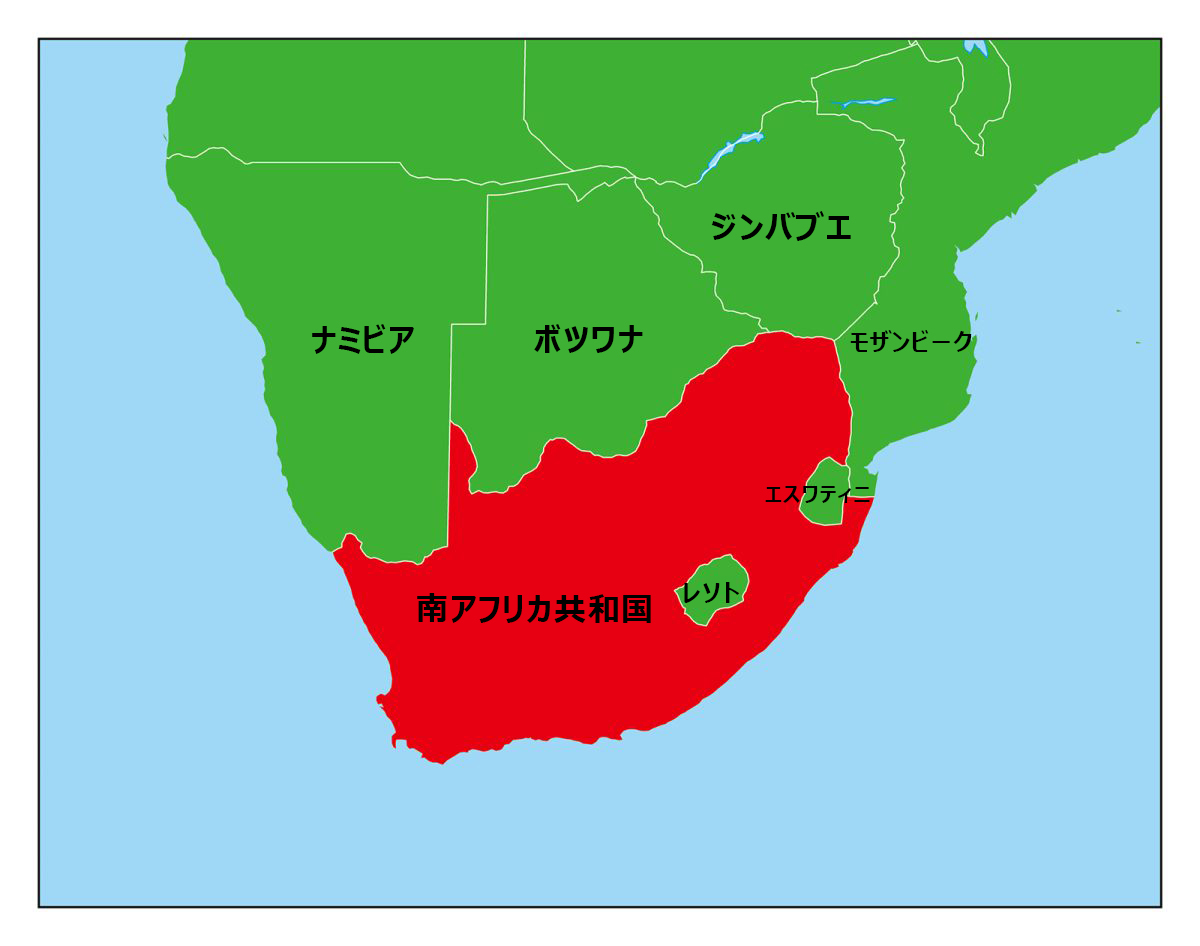 南アフリカは、アフリカ大陸最南部に位置します。隣接する国には、ナミビア、ボツワナ、ジンバブエ、モザンビーク、エスワティニがあり、レソトを囲んでいます。