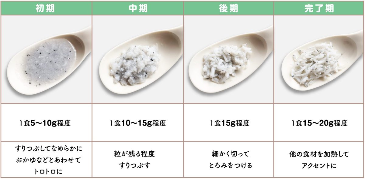 まだ歯が生えていないので舌とあごで押しつぶして食べます。しらすを茹でて塩抜きしたものを水気を切って粒が残る程度に軽くすりつぶします。野菜やおかゆと混ぜて使うと食べやすくなります。
