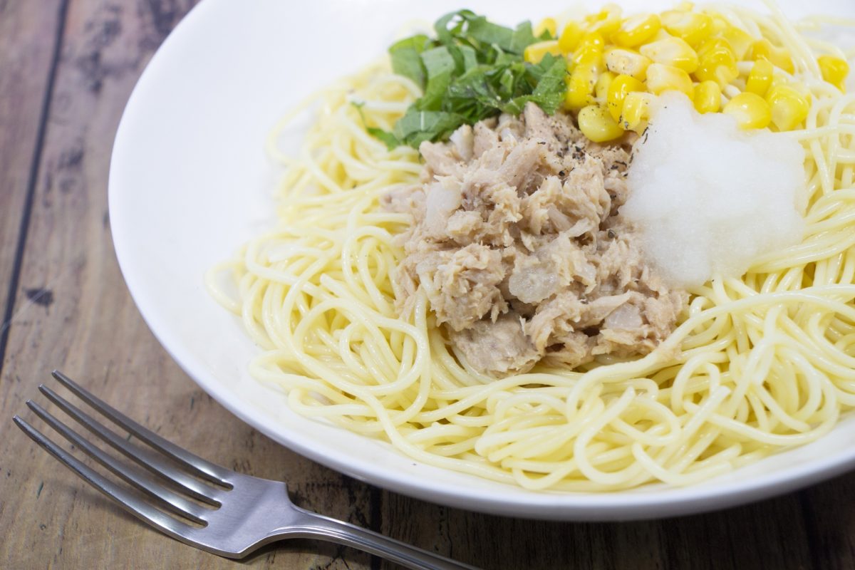 ツナの油分が気になるときは、大根おろしを添えるとさっぱりとした味になります。大根は、おろしてから時間が経つほど辛みが和らぎ、子どもでも食べやすい味になりますよ。よく冷やしておくと、暑い季節でもさっぱりと食べられます。