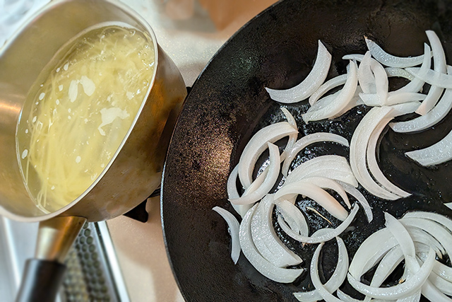 【1】鍋にたっぷりのお湯を沸かし始めます。その間に玉ねぎを薄切りにします。繊維に沿って切ると、炒めたときに食感が残ります。