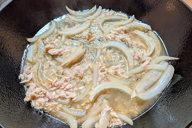 玉ねぎに火が通ったら、ツナ缶を汁ごと加えます。全体を軽く炒めたあと、めんつゆ、ゆで汁、鶏がらスープを加えて、煮立たせます。