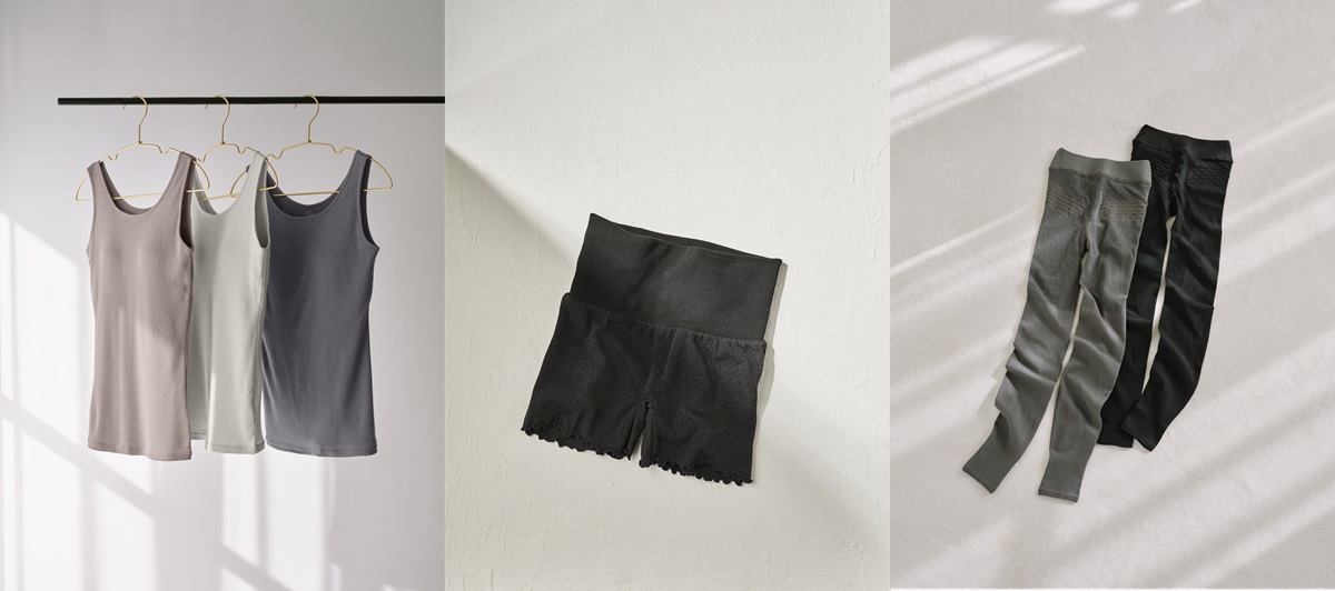 生地には肌に優しいレーヨンシルクを採用し、吸湿性も兼ね備えた柔らかな着用感を実現。さらに、天然系デオドラント加工により繊維上の細菌の増殖を抑制し、ウエストゴム部の肌面側には遠赤外線効果のある炭化綿を採用しています。