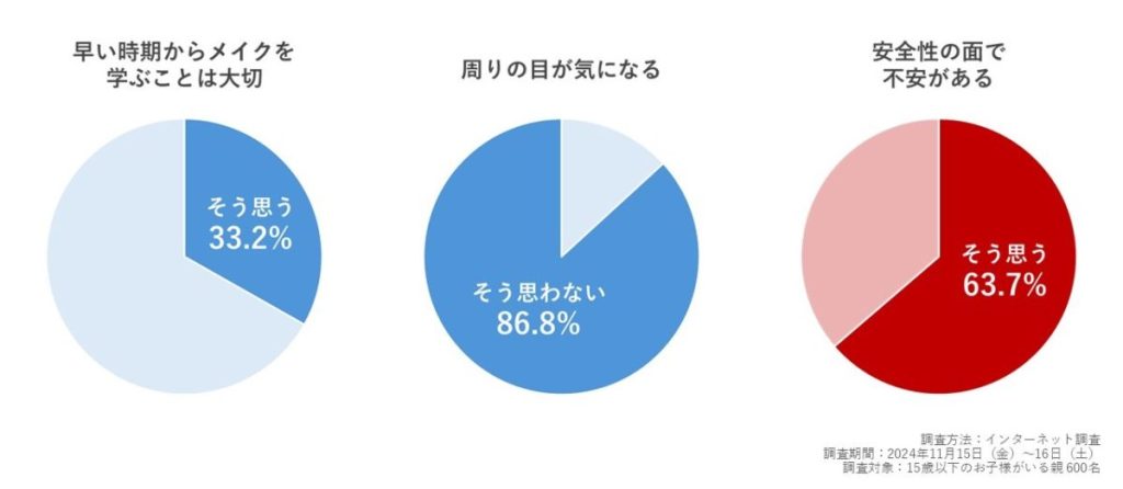 ampule岡部さん:キッズメイクに関しては、「メイクは早い時期から学ぶべき」と考えている方が約3人に1人、「周囲の目は気にならない」と答えた方は約9割という結果でした。一方で、安全性に不安を感じているという回答も6割以上あり、慎重な意見も多く見られました。