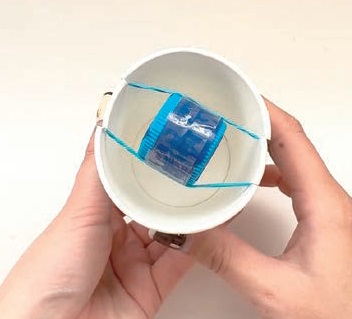 車輪部分ぶんが床につかないとうごきません。紙コップの切り込みは、深くなりすぎないようにご注意を。うまくうごかないときは、ねじる回数を多くしたり、重りを重たくしてみよう。