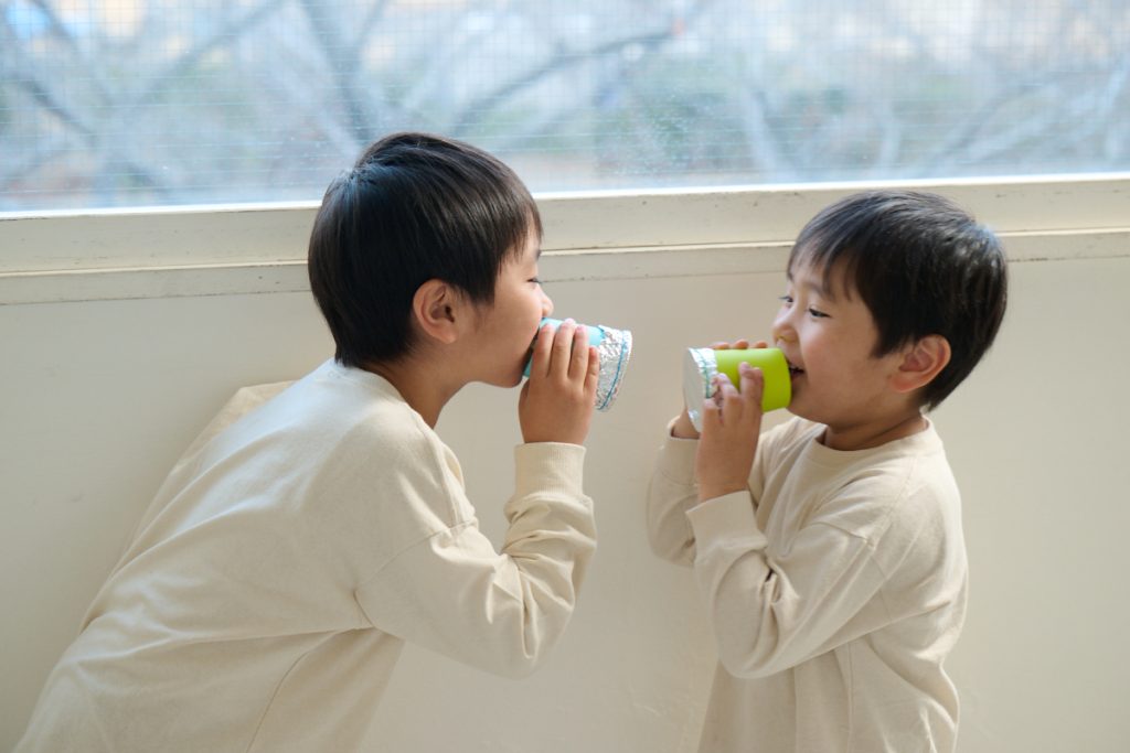 紙コップを通して話すと、いつもと自分の声が違って聞こえることにおどろき、「どうして?」と好奇心が芽生えます。