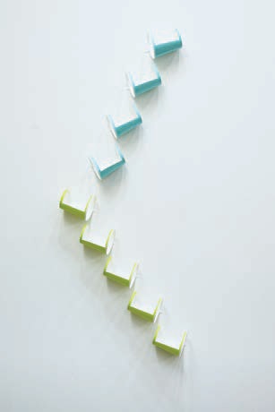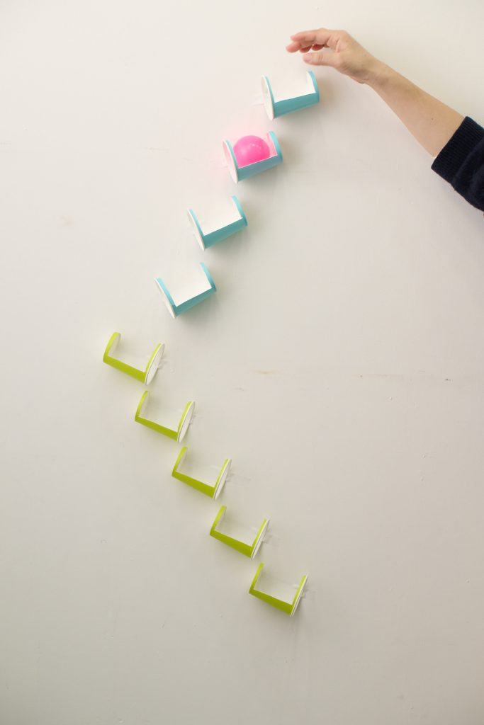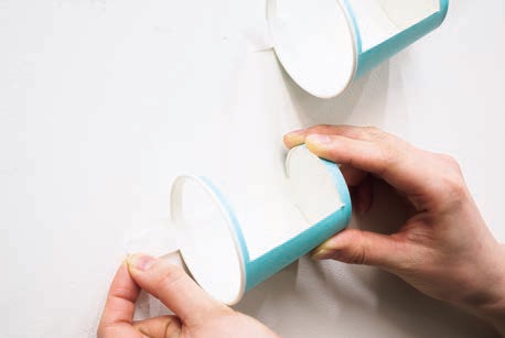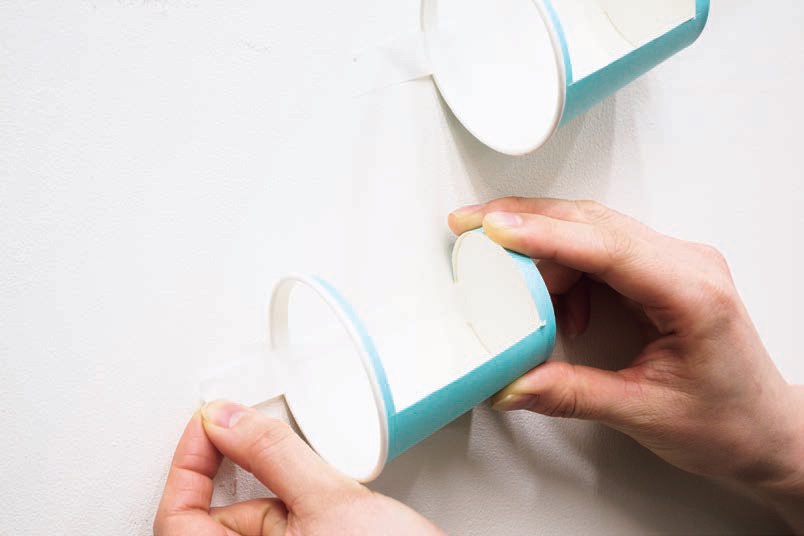 ③ ①を壁に貼る。穴の開いた方を上向き、 カップの口をやや下向きに設置するとボールが転がりやすい