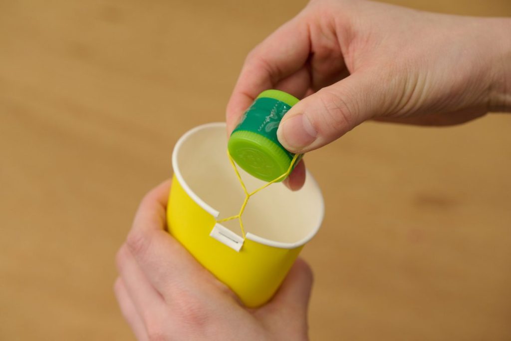 キャップをくるくると回してねじる作業は、手指のトレーニングになります。紙コップに好きなイラストを描くことで創造力も育まれます。