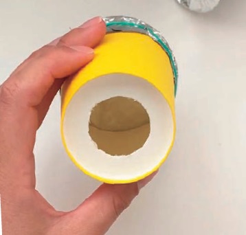 ②紙コップの口の部分にアルミホイルをかぶせ、輪ゴムでとめる