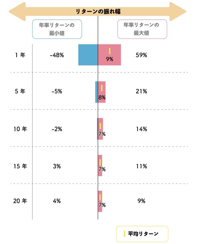 下の図は、全世界株式に投資した際の、保有期間ごとのリターンの振れ幅と平均値を示したものです。