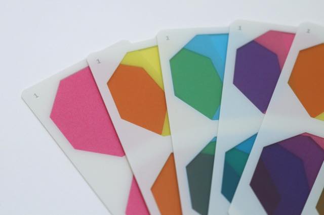 カードは6枚で1セット(カードには1〜4の番号がつけられていて、同じ番号の6枚が1セットになります)。2つの穴にシアン・マゼンタ・イエローの透ける素材が貼られていて、2枚カードを重ねるとさらに3種類の色を作ることができます。3枚以上重ねてはいけません。