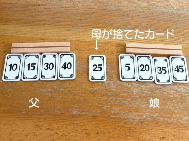他のプレイヤーが捨てたカードから「娘は○の段を集めている?」「お父さんは何を狙ってるんだろう」と読み取る力も勝つための技と言えるかもしれません。