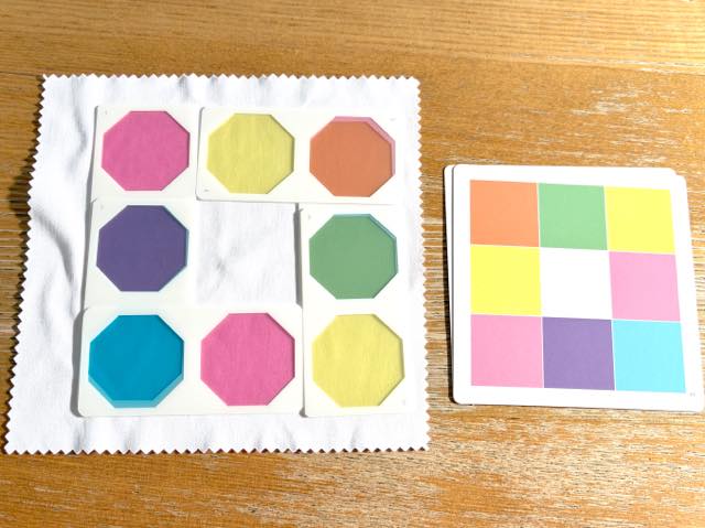 お題カードには縦3マス×横3マスの9マスに6つの色のいずれかもしくは、白(カードを置かない場所)が塗られています。カラータイルでお題カードと同じ色の並びを最初に作れたプレイヤーが勝ちです。お題カードはなんと50種類。