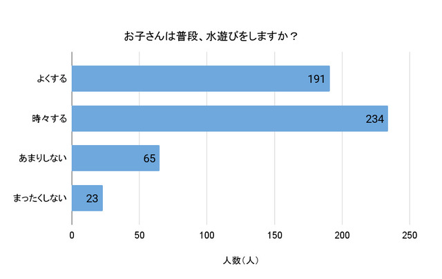 まずはこんな質問から。「お子さんは普段、水遊びをしますか?」という問いでは、「よくする」191人、「時々する」234人、「あまりしない」65人、「まったくしない」23人となりました。「よくする」と「時々する」を合わせると425人で、全体の約82%の人が「水遊びをする」と答えています。