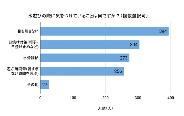 「水遊びの際に気をつけていること」を尋ねたところ、「目を離さない」が394人と圧倒的に多く、次いで「日焼け対策(帽子・日焼け止めなど)」が304人、「水分補給」が273人、「遊ぶ時間帯(暑すぎない時間を選ぶ)」が256人と続きました。