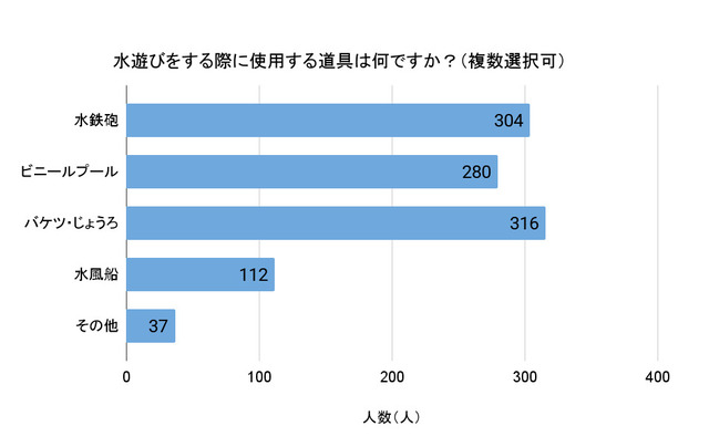 水遊びをするときに、みなさんのご家庭では、どんな道具を使用しているのでしょうか。これには僅差で「水鉄砲」「ビニールプール」「バケツ・じょうろ」の3つがトップに並びました。