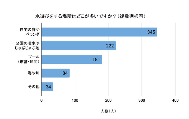 ちなみに「その他」と答えた人の意見で最も多かったのは「お風呂」。お水やぬるいお湯を張れば手軽に水遊びが楽しめるお風呂もいいですよね。おうちの中なので、危険性が比較的低いのも安心できるポイントなのかもしれません。