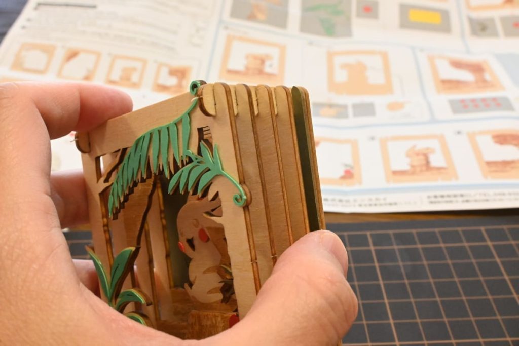 子どものペーパーシアターを見ていて触発された筆者も、ペーパーシアターにチャレンジしてみました。紙ではなく木を使って組み立てる「ペーパーシアター ウッドスタイル」です。難易度は3。