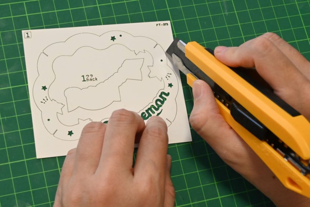 まずはパーツを切り離していきます。といってもほぼレーザーでカットされているので、カッターナイフを入れるのはほんの一部分のみ。カッターナイフが必要な場面は保護者がサポートしてあげるといいでしょう。今回は筆者がパーツを切り取り、組み立てを子どもが担当しました。