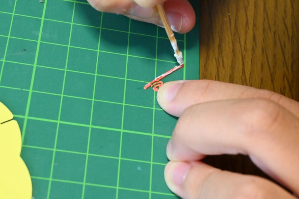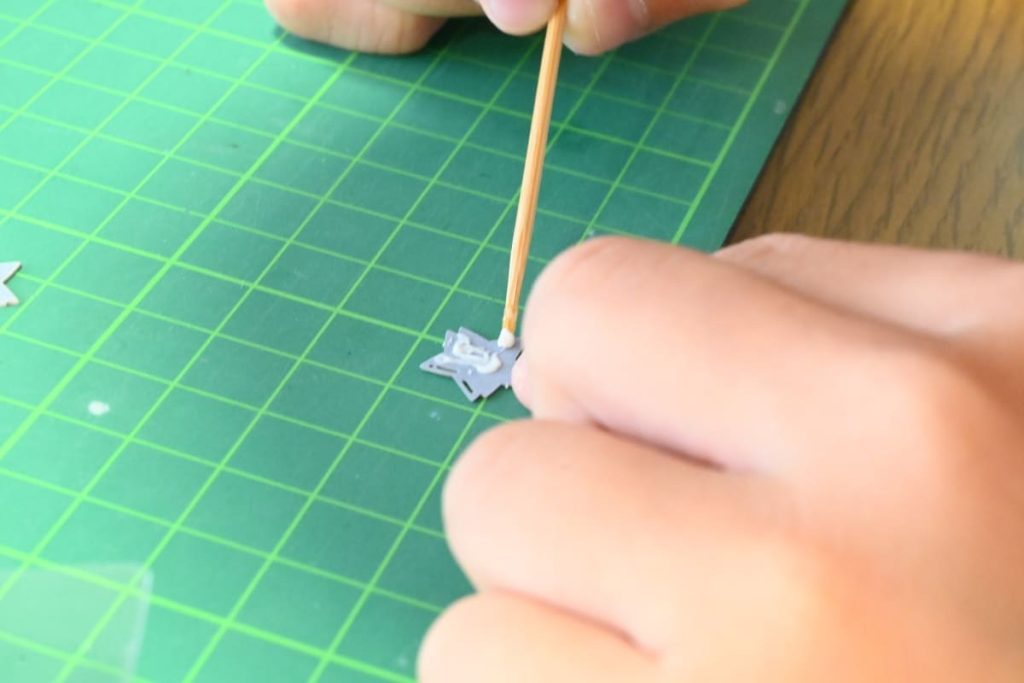 小さなパーツ一つ一つに接着剤をつけていきます。接着剤は別の場所に出しておき、つまようじを使って塗っていきました。この作業がとても細かいので、幼児や低学年の子どもには難しいかもしれません。細かい工作に慣れている子どもや、高学年の子どもだと、充分ひとりで組み立てることができます。