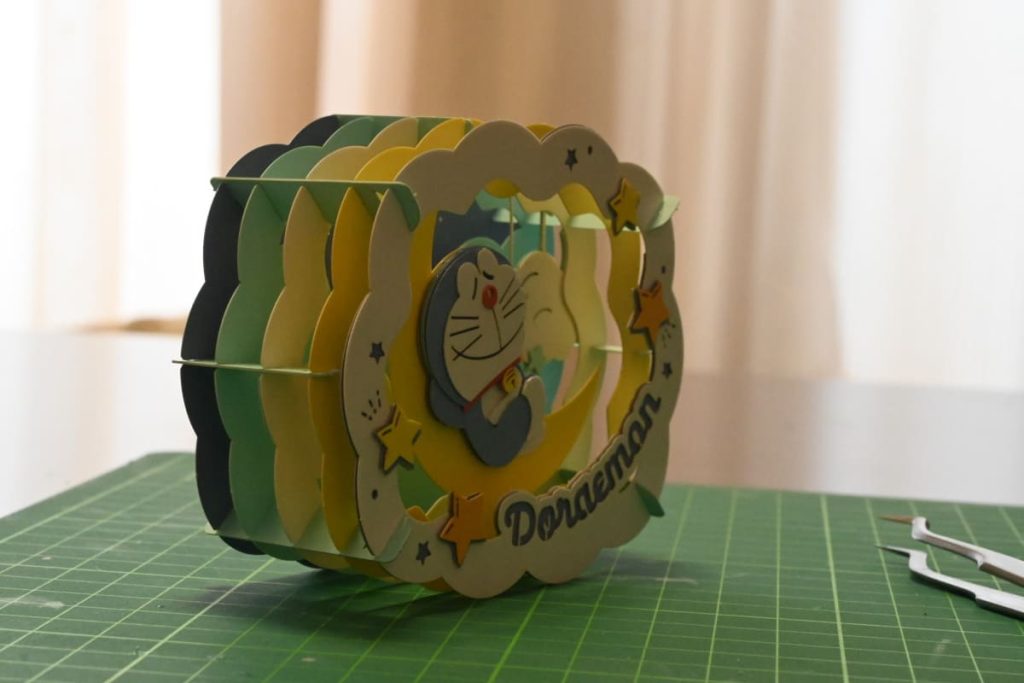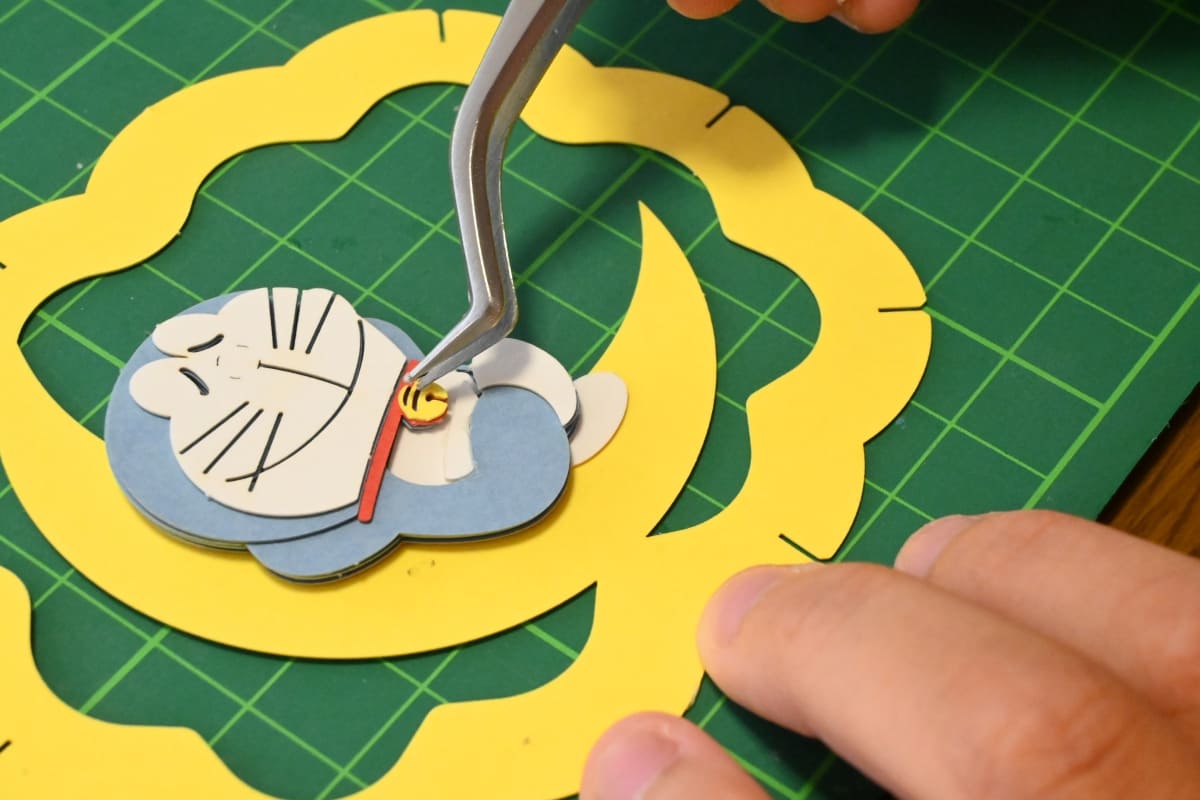 1枚1枚は紙ですが、立体的に張り合わせた作品はとても丈夫で、自立もするので飾ることができます。立体的に重なったドラえもんの作品がとても美麗!