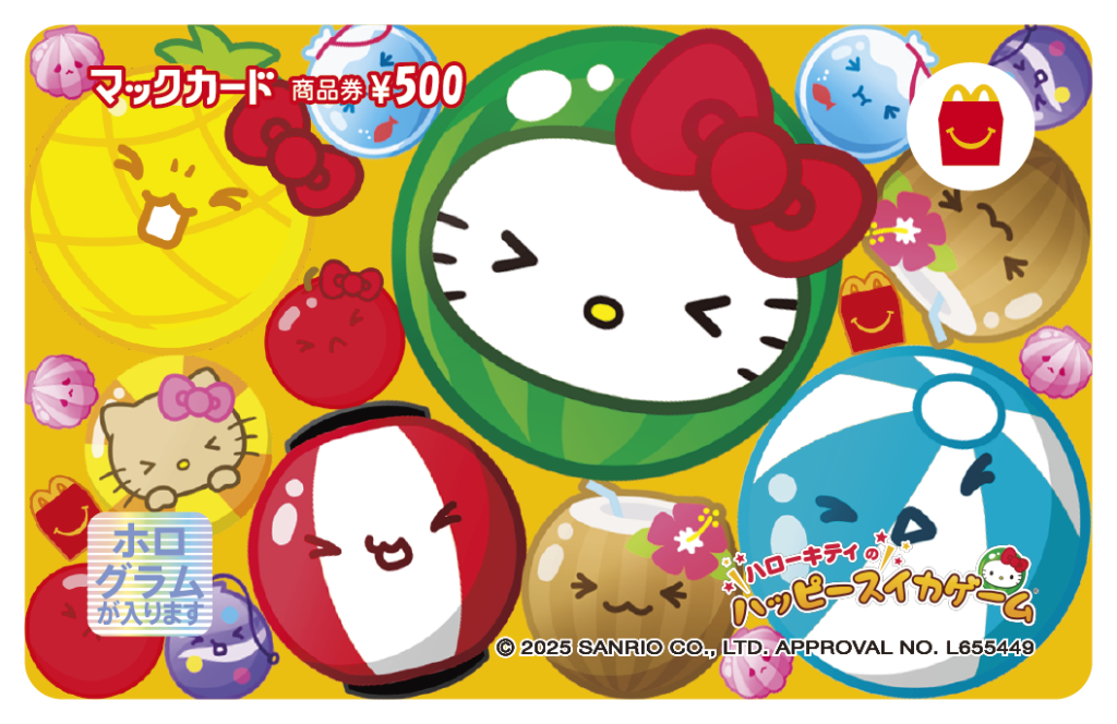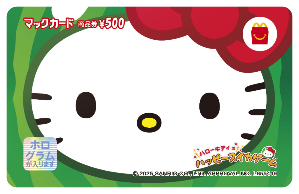 ⑤ 「#ハローキティのハッピースイカゲーム」のハッシュタグを付けてXでシェアしていただいた方の中から、抽選で合計50名様に、ハローキティオリジナルのマックカード1,000円分が当たります。