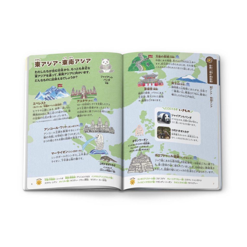 人気旅行ガイドブック「地球の歩き方」のハッピーセットオリジナル版です。世界中の有名な建築物や、美しい景色、ユニークな動物たちを紹介しています。図鑑に記載されたQRコードをスマートフォンで読み込むと、デジタルパズルゲームで遊ぶことができます。巻末にある世界遺産クイズやめいろもあわせてお楽しみください。