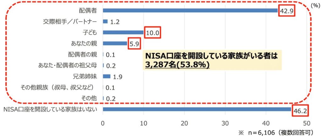 日本証券業協会の「新NISA開始1年後の利用動向に関する調査」によると、新NISA利用者の53.8%が「家族もNISA口座を開設している」と回答。最も多いのは配偶者で42.9%でした。