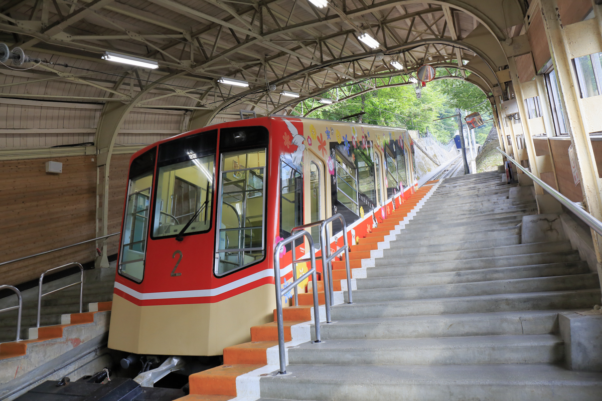 日本で最初に開業した歴史あるケーブルカーで、犬や猫の形をしたかわいい車両が人気です。山の上には遊園地もあり、子ども連れにぴったりの観光スポット。日本では珍しいケーブルカーの踏切もチェックポイントです。