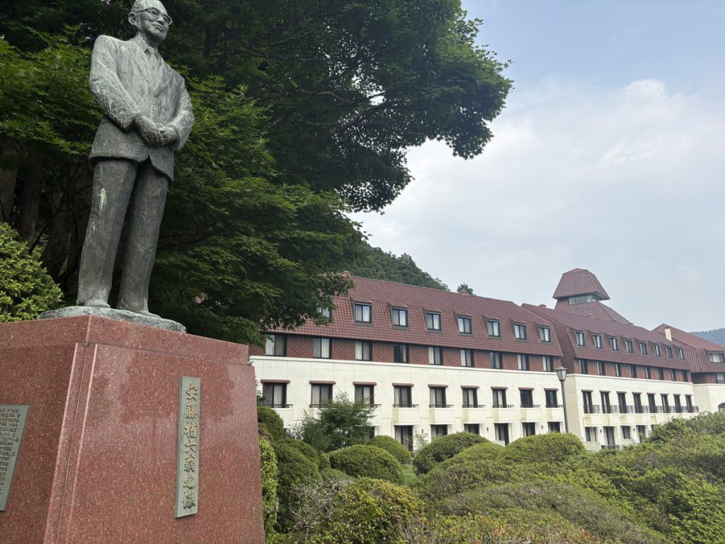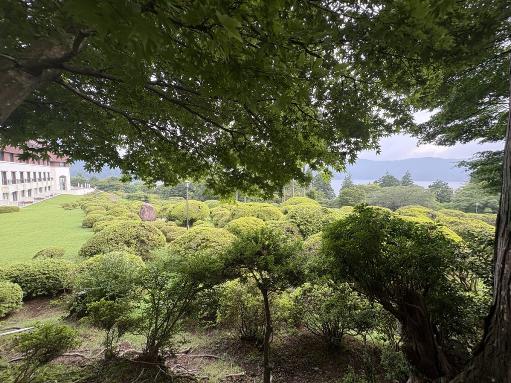 山のホテルといえば、映画のロケ地として何度も使われた名所。5月のつつじの時期は特別公開も行われて、宿泊以外の方の来館も増えるそうです。館内には川瀬巴水による庭園を描いた版画で約80年前と今の風景が変わらないことが確認できます。
