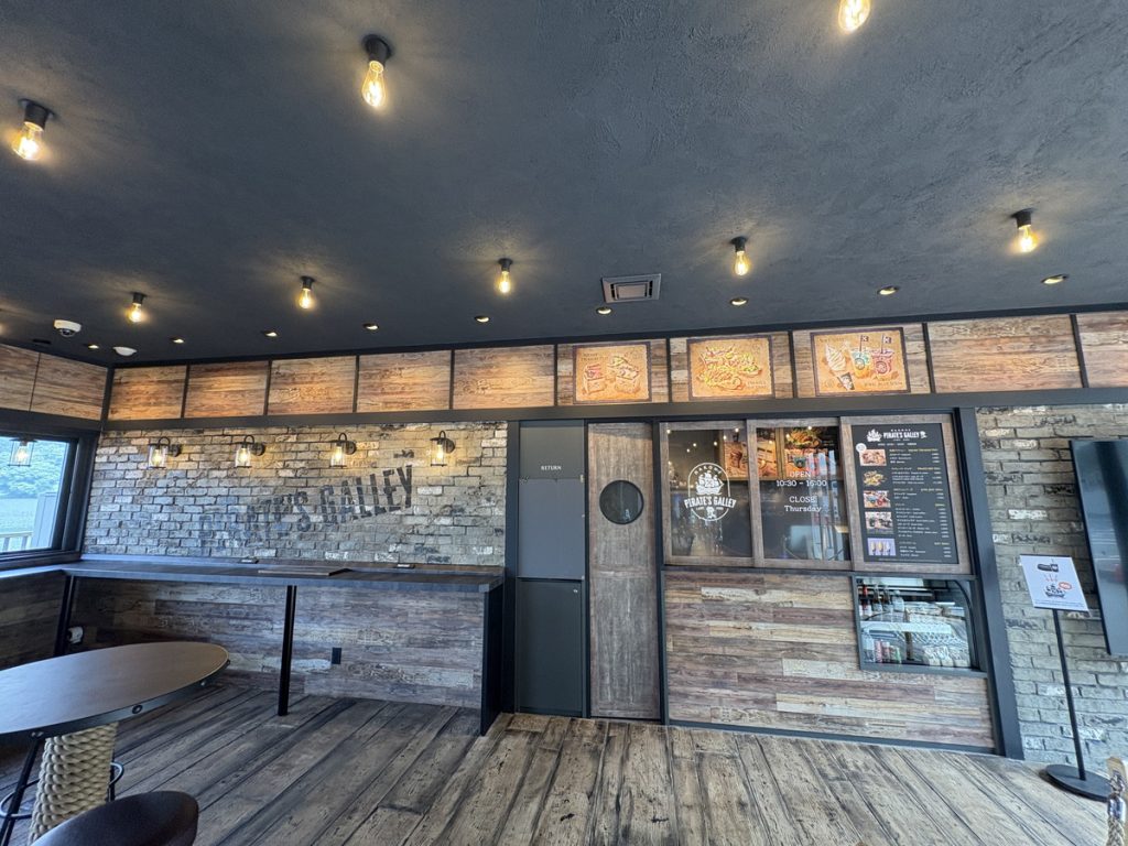 ロビーには「PIRATE’S GALLERY」というスタンドカフェがオープン。アンティーク感のあるレンガ調の壁とフィラメントランプの装飾で乗船前から気分を上げてくれます。