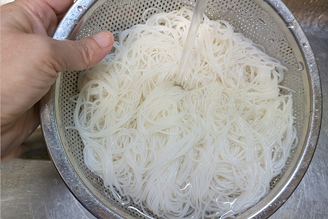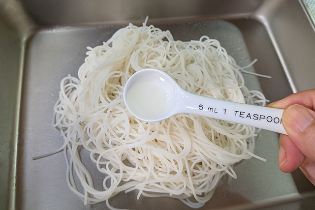水を切ったビーフンに、油(小さじ1/2:分量外)を回しかけ、全体にまぶしておくと、麺がくっつきません。