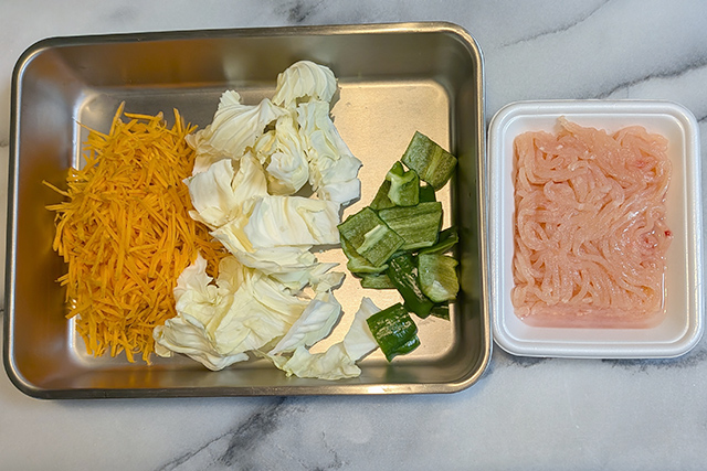 【3】にんじんは細切りにし、キャベツとピーマンは食べやすい大きさに切ります。