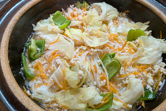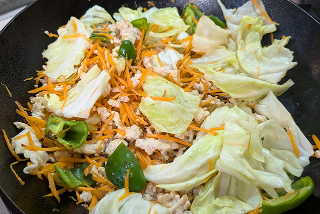 【4】キャベツとにんじんを加えます。火が通ったら、ビーフンとピーマンを加え、2~3分煮込みます。全体がなじんだら、塩こしょうで味を調え、完成です。