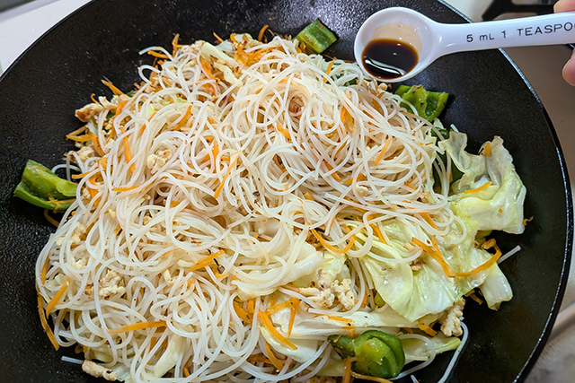 【5】野菜がしんなりしたら、ビーフンを加えて混ぜ、炒め合わせます。