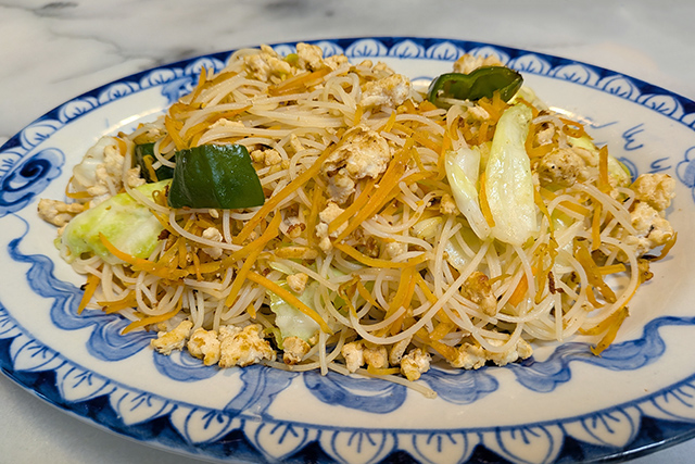 野菜の甘みと、鶏肉のうまみが引き立つ、定番の炒めビーフンです。冷蔵庫の野菜を組み合わせてアレンジすることもできます。