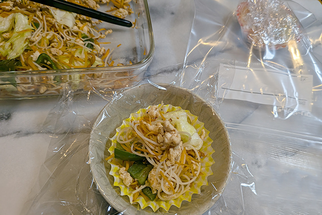 調理したビーフンを、冷ましてから1食分ずつ小分けし、密閉して冷凍しておくと便利ですよ。解凍は電子レンジで加熱し、途中で一度混ぜるとムラなく仕上がります。