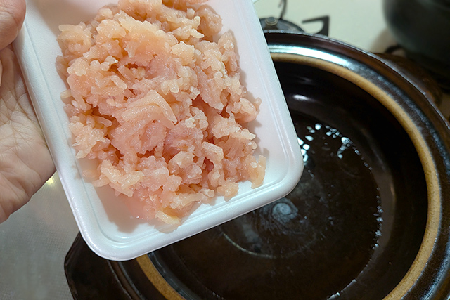 【3】鍋に水とコンソメを入れて火にかけ、鶏ひき肉を加えます。